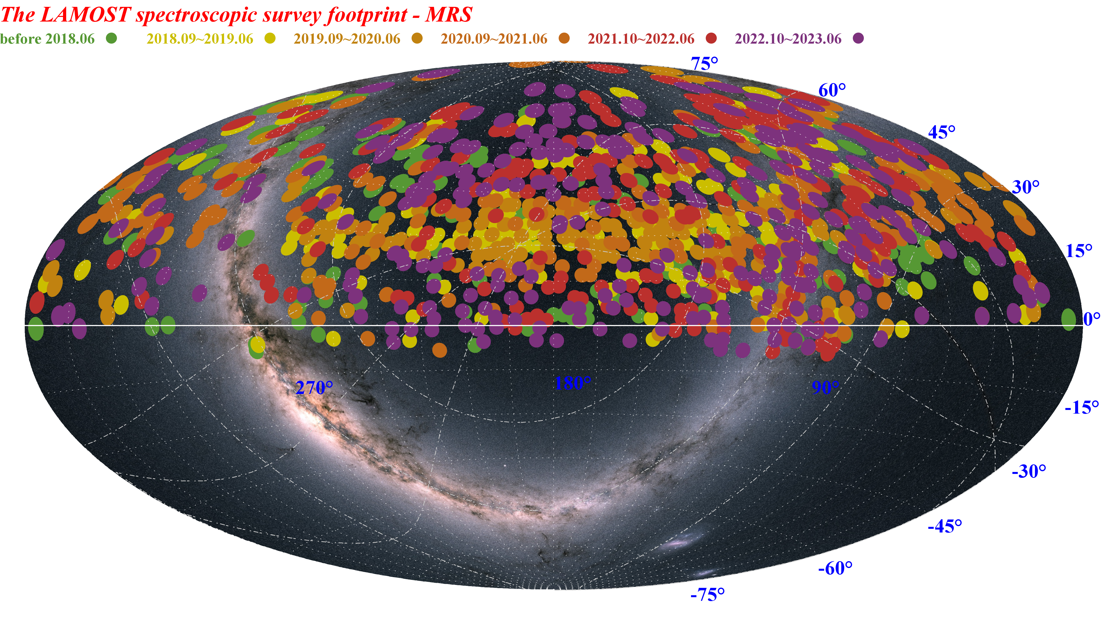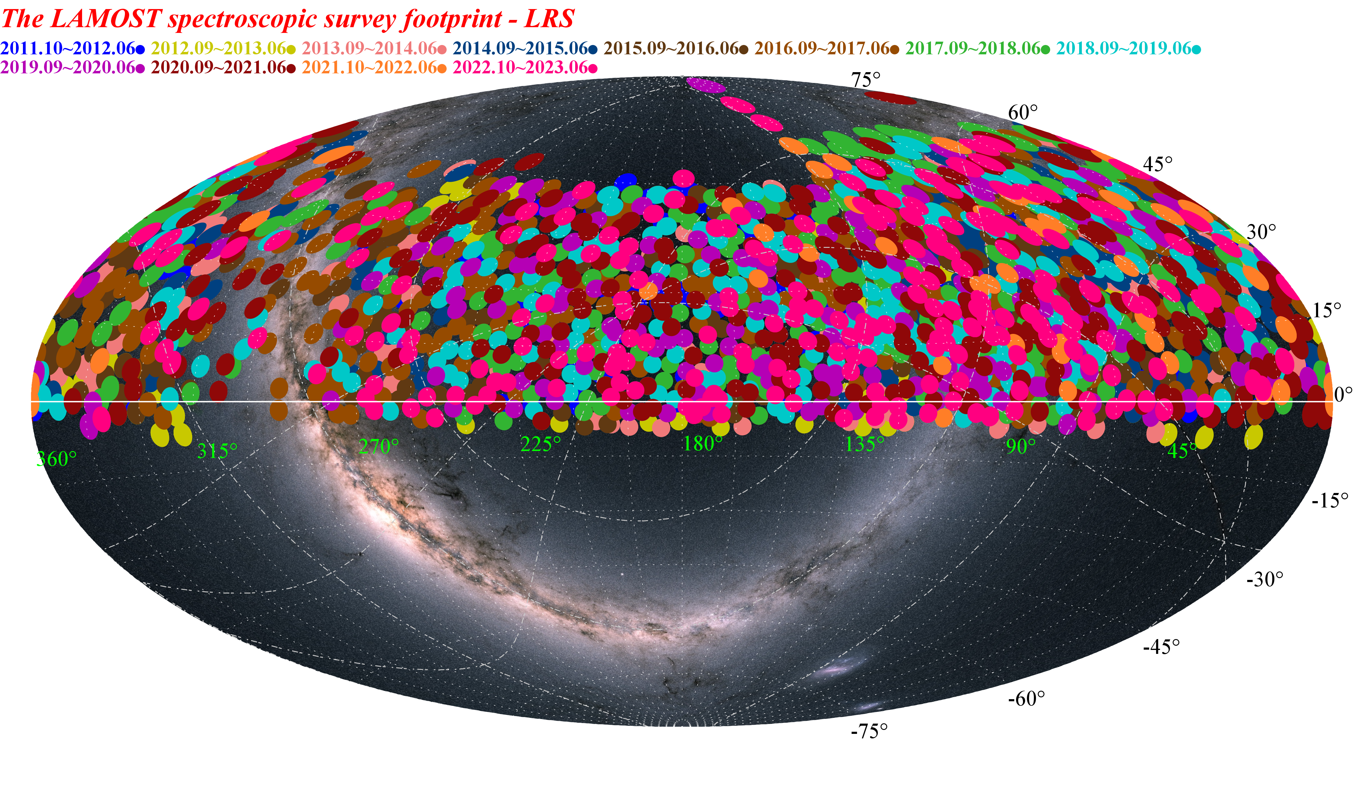 DR11数据集获取于2011年10月-2023年6月,包含了低分辨率光谱数据和中分辨率光谱数据两部分。DR11数据集(v2.0版本)共发布2508万条光谱,包括1193万条低分辨率光谱,1315万条中分辨率光谱,中低分辨率光谱均突破千万。此外,还发布了1049万组的恒星光谱参数星表。LAMOST继续保持发布光谱数和恒星参数星表总数国际第一的地位。